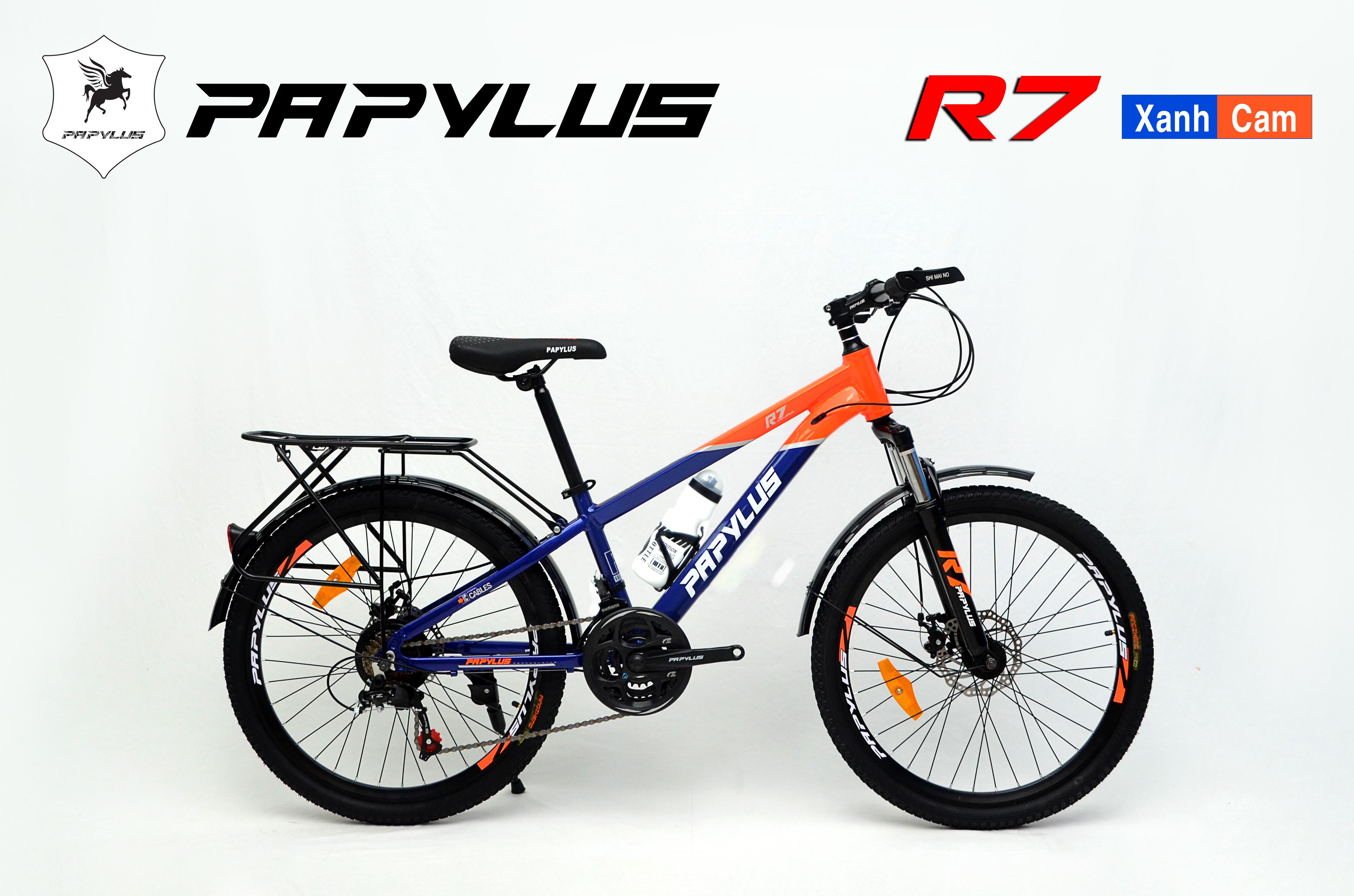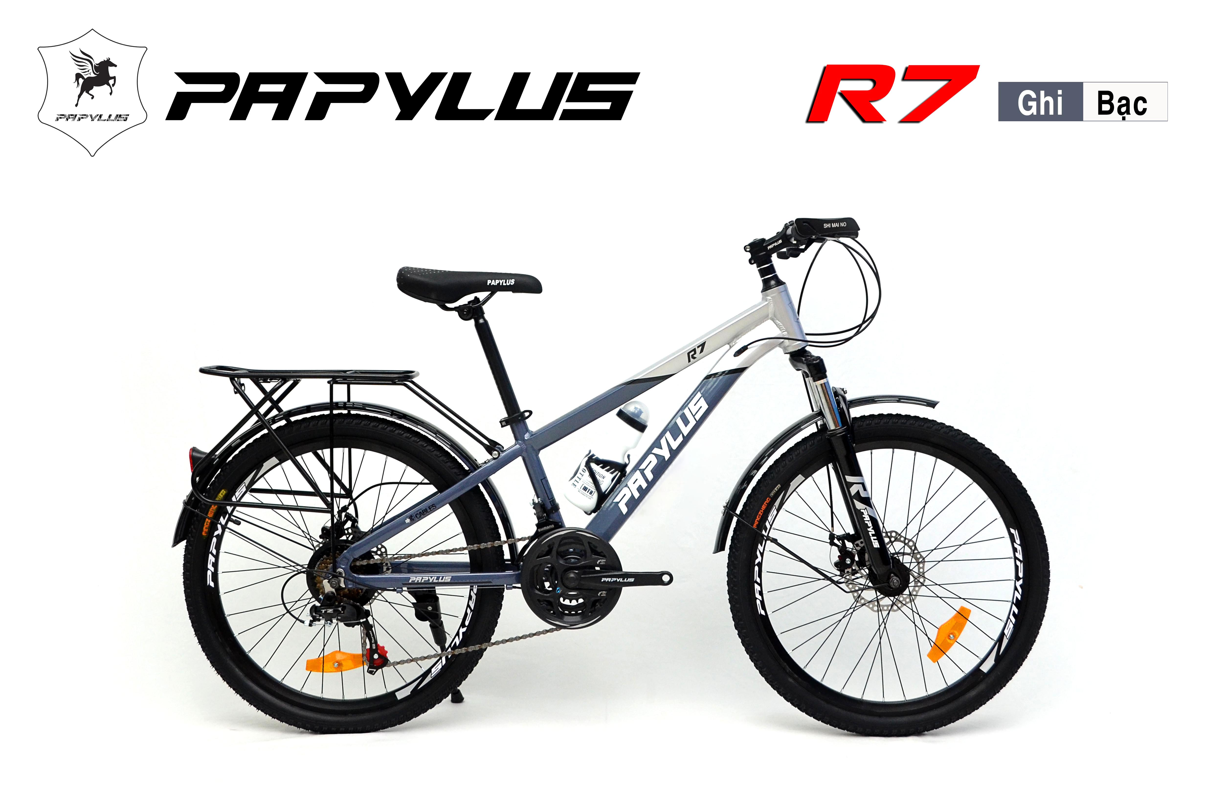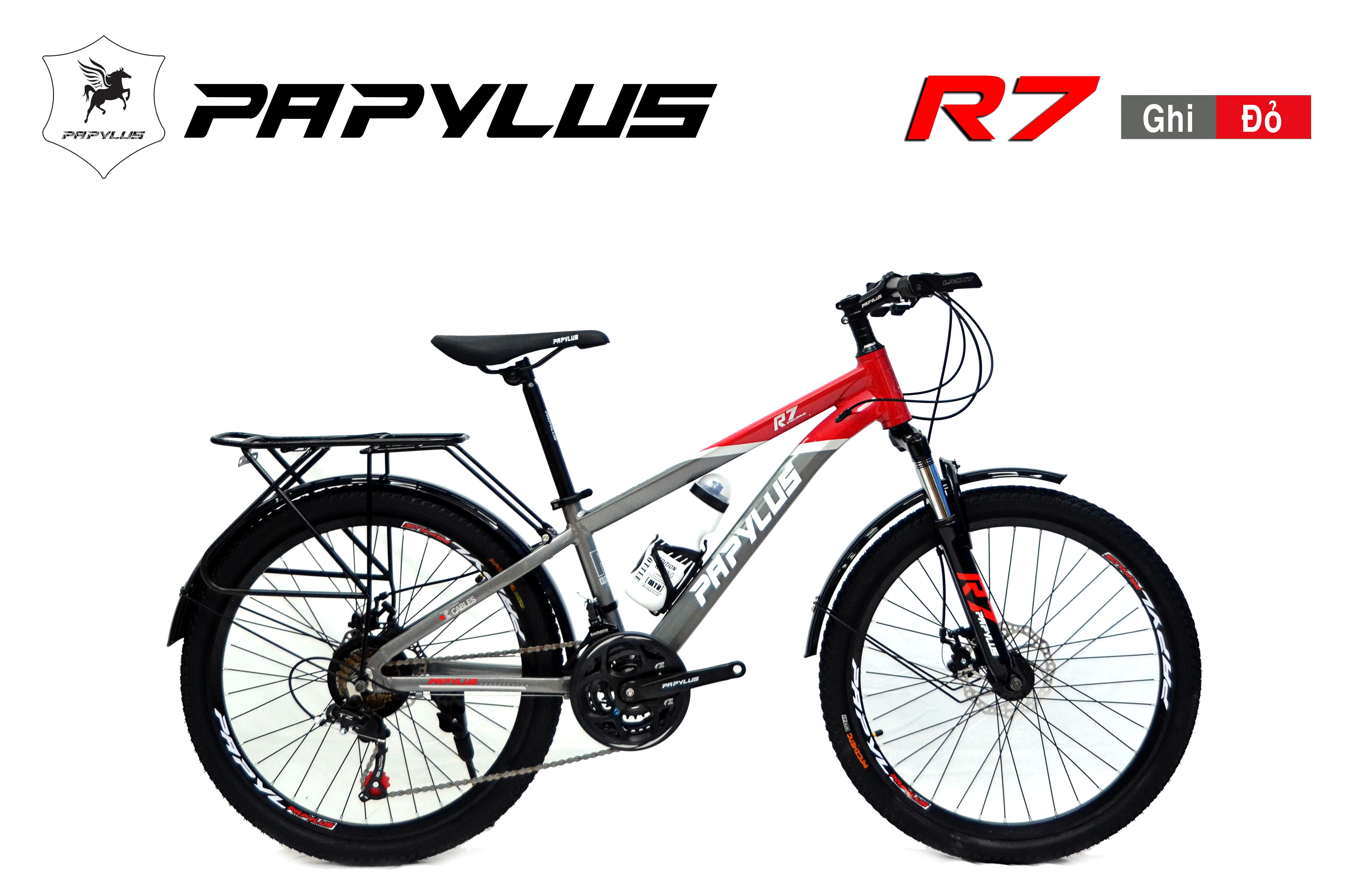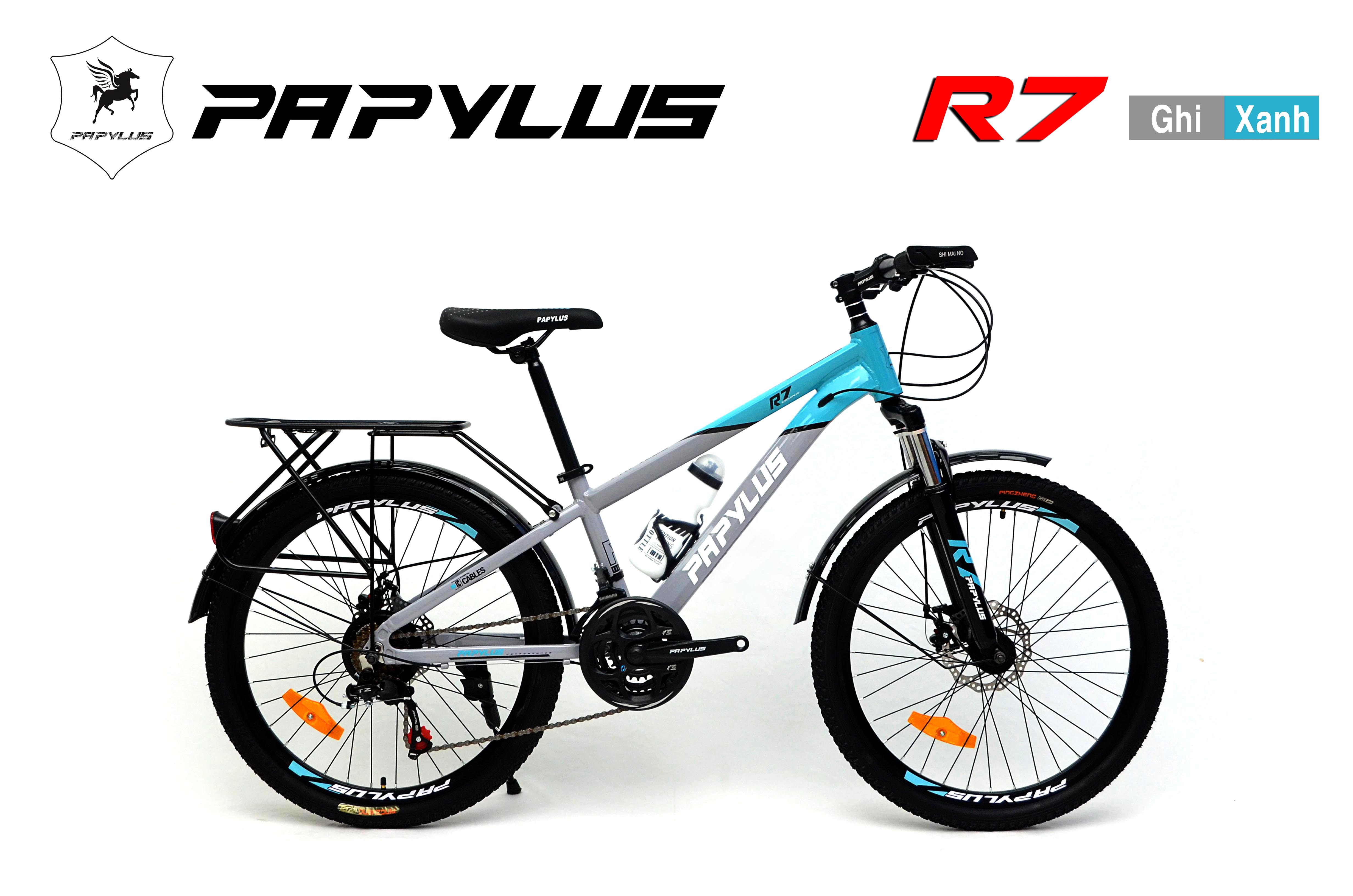 Xe đạp địa hình PAPYLUS R7 Xe đạp thể thao nhập khẩu nguyên chiếc, chất lượng cao, mẫu mã đẹp, màu sắc đa dạng. PAPYLUS R7 sử khung Nhôm nhẹ cùng bộ truyền động SHIMANO 21 tốc độ bền bỉ, phanh đĩa, cỡ bánh 24 inch. Chiếc xe này hoàn toàn phù hợp với các bạn học sinh cấp 2, là phương tiện đi học rất tiết kiệm và còn tăng cường sức khỏe.